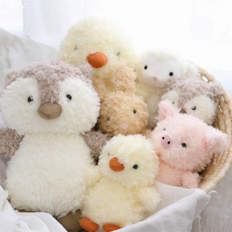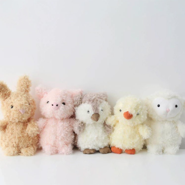 Non seulement cela, nous utilisons un tissu en peluche de haute qualité et très doux pour fabriquer ces jouets en peluche aux cheveux bouclés. L'intérieur est rempli de coton PP très moelleux. Outre le tissu, en termes de fabrication, certains détails, tels que les mains, les pieds et les yeux des petits animaux, sont tous transformés à la main. La bouche est cousue avec du fil, et tous les détails sont très exquis et beaux.