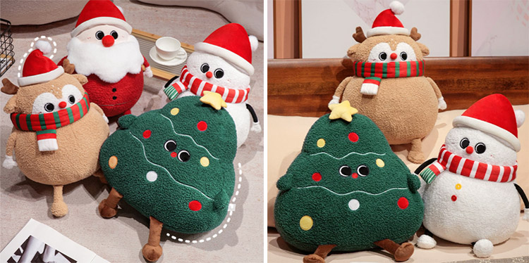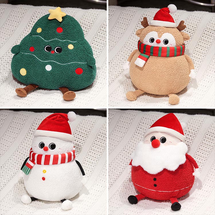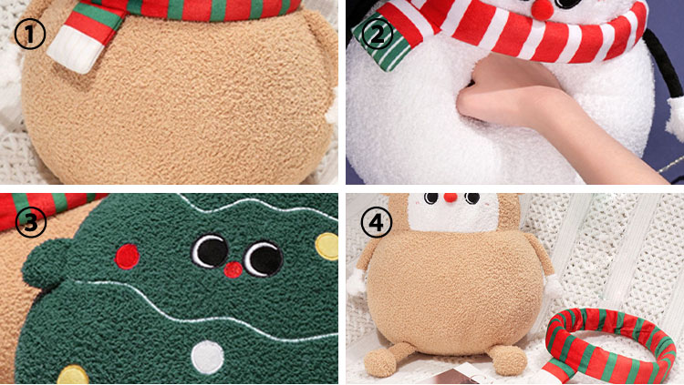 Ces quatre jouets différents sont tous très mignons: il y a un Père Noël avec une barbe, un arbre de Noël et les décorations sur cet arbre de Noël sont représentées à travers des points circulaires de différentes couleurs. Il y a aussi une décoration d'étoile au sommet de l'arbre. De plus, il y a un bonhomme de neige et un cerf portant des écharpes et des chapeaux. Ces quatre styles différents d'ornements de Noël moelleux sont tous cousus avec des bras et des jambes pour les rendre plus anthropomorphes et animés, et leurs formes sont toutes joufflutes et très mignonnes. Il convient d'être utilisé comme un oreiller à lancer. Le tenir sera très confortable.
